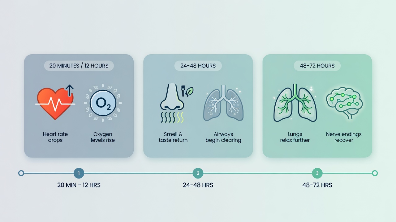 Entro venti minuti dall'ultima sigaretta, la pressione arteriosa e il battito cardiaco tornano ai livelli normali, mentre i polmoni iniziano a liberarsi del muco accumulato: la tosse può intensificarsi, ma questo è un segnale positivo che indica che il corpo sta guarendo. Contemporaneamente, emergono i primi sintomi dell'astinenza da nicotina, tra cui irritabilità, ansia, difficoltà a dormire, calo della concentrazione e soprattutto una forte voglia di fumare. Questi disturbi, sebbene intensi, sono normali e rappresentano sintomi fisici transitori che iniziano a diminuire gradualmente dopo il quarto giorno.