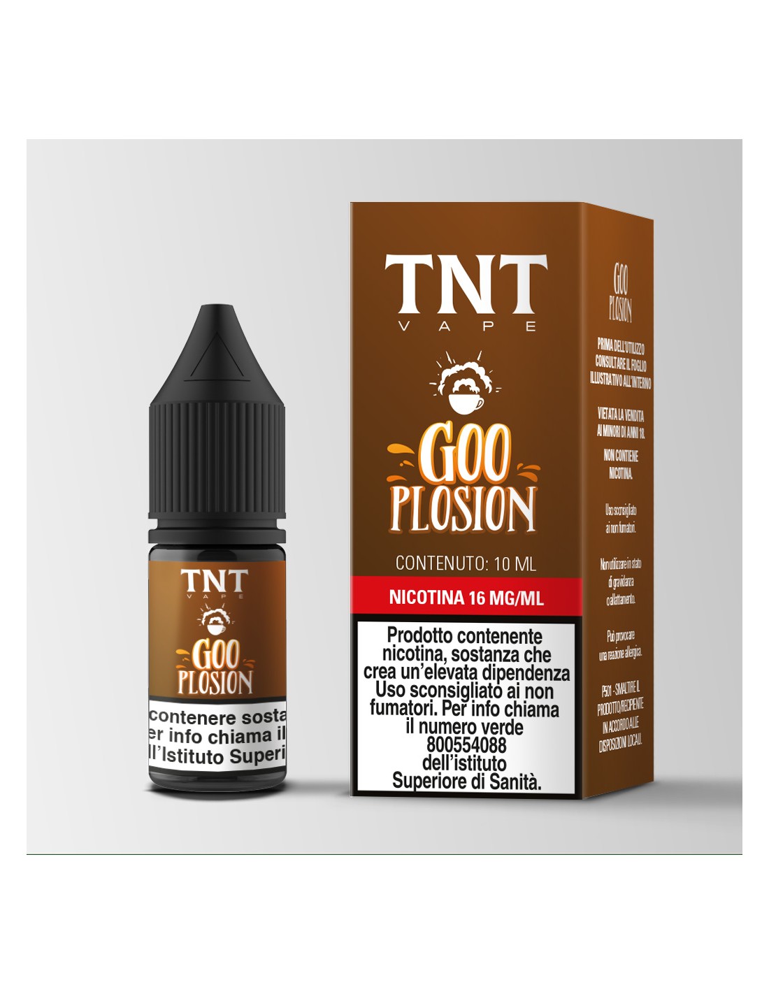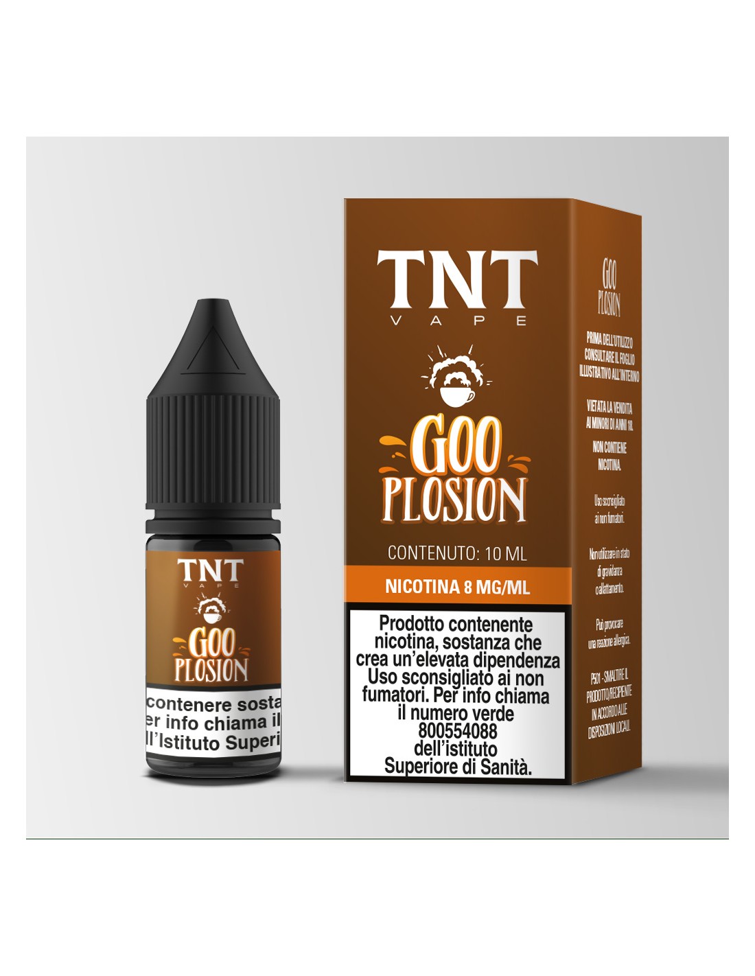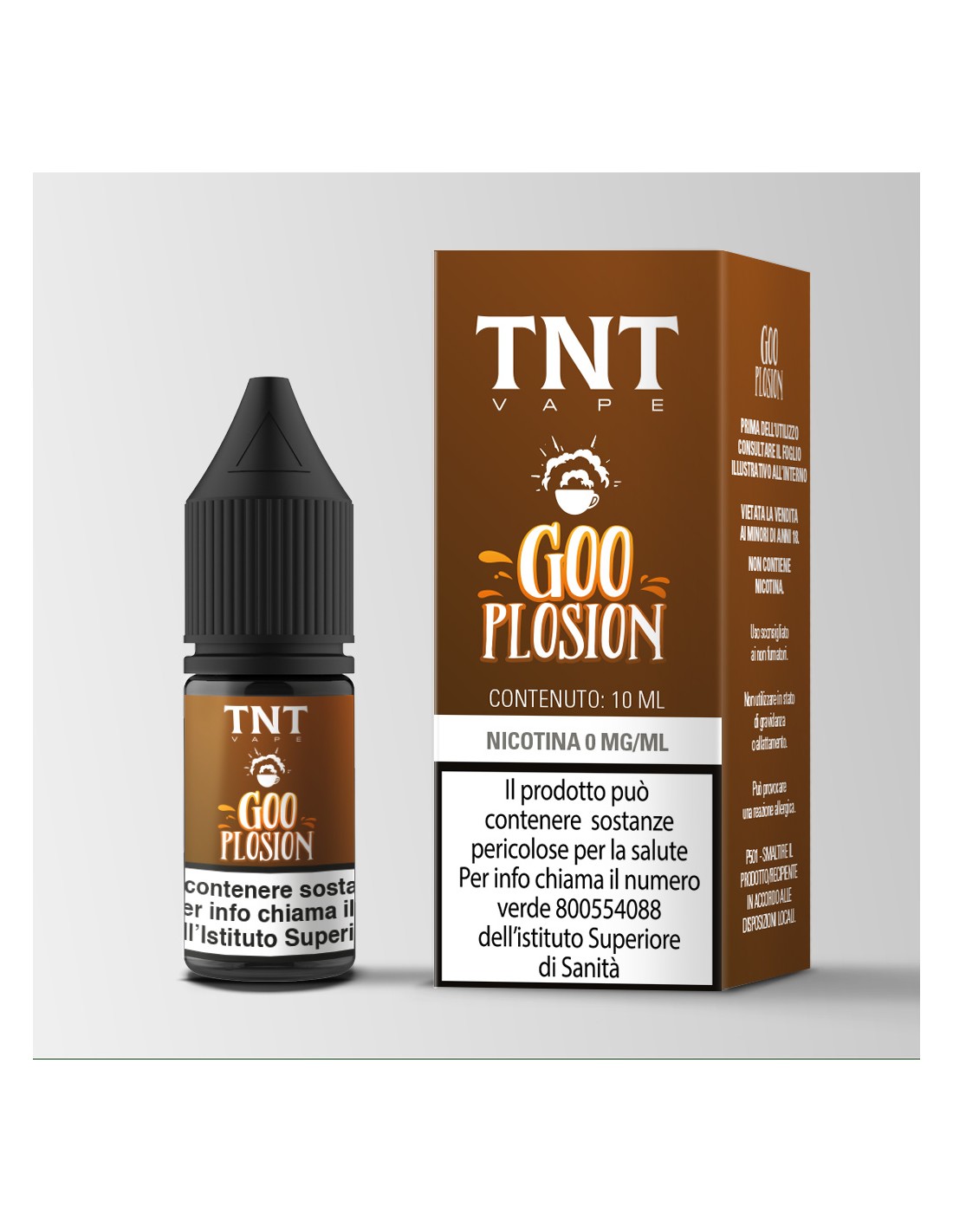 Il Liquido Pronto Goo Plosion 10ml con o senza nicotina di TNTVAPE è tabaccoso tuscan unito a caffè espresso, vaniglia e biscotto per sigaretta elettronica.