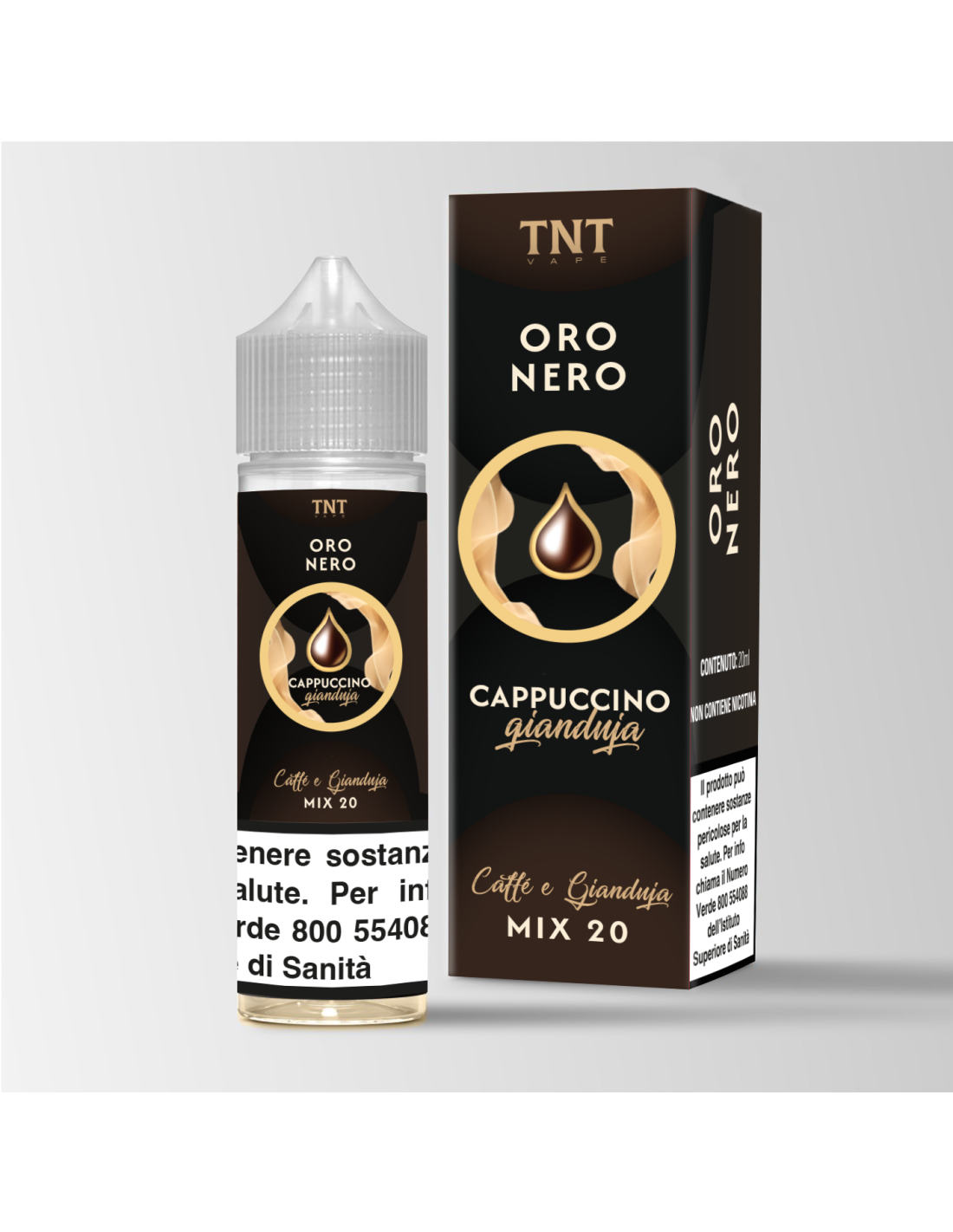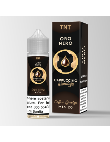 Oro Nero - Cappuccino Gianduja MIX20 si presenta in un flacone contenete 20ml di liquido per sigaretta elettronica.